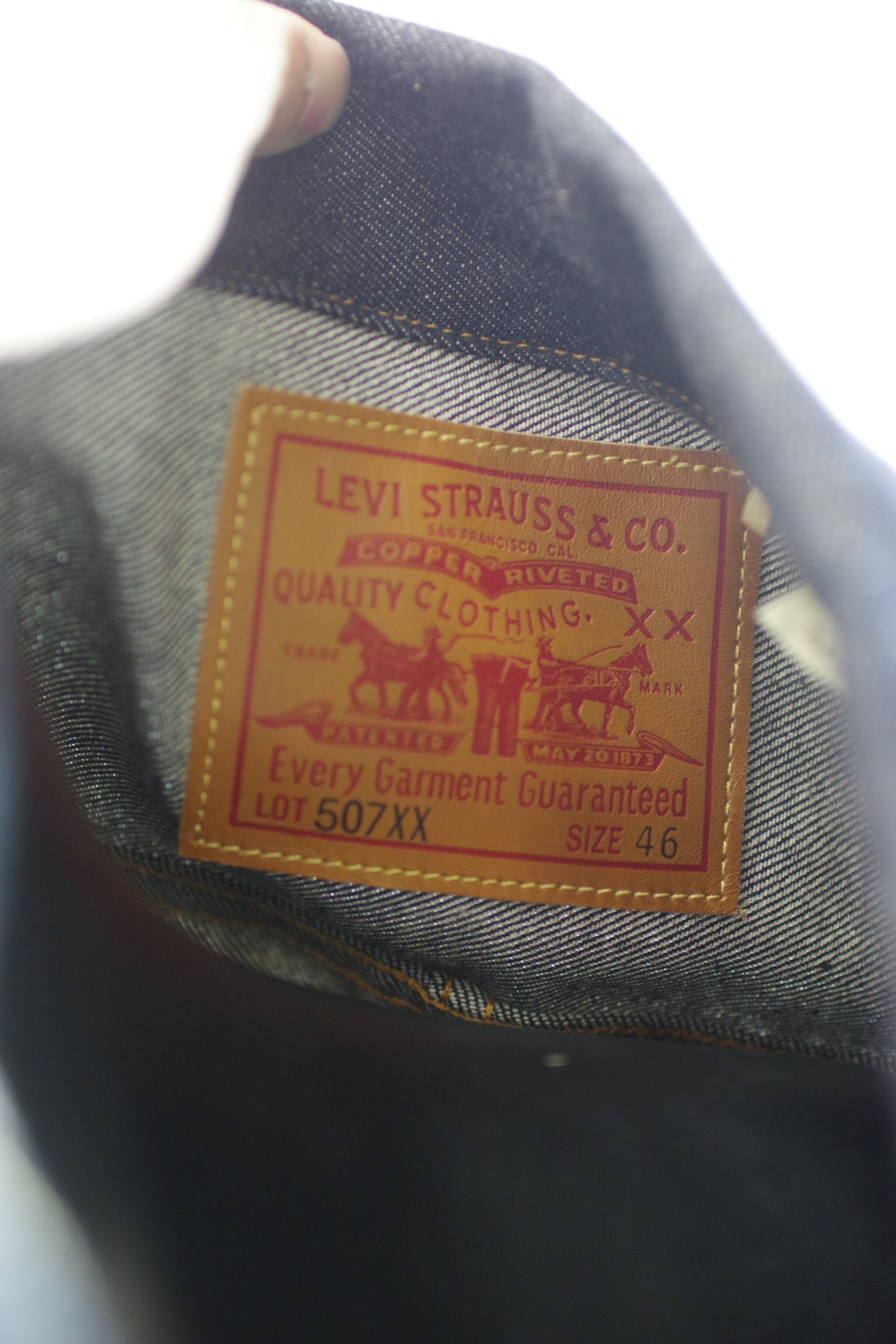 「Two Horse」のロットナンバー507レザーパッチ、ダブルプリーツが入った前立て、ウエストのアジャスターと大文字の「E」のレッドタブが特徴です。
